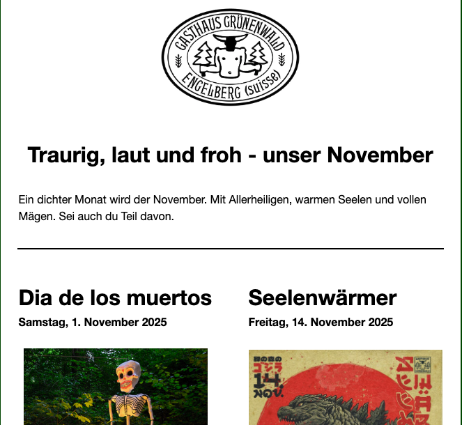 Verein Gasthaus Grünenwald informiert ihre Kunden und Geschäftspartner in regelmässigen Abständen mit einem Newsletter über Angebote des Unternehmens. Der Newsletter unseres Unternehmens kann von der betroffenen Person grundsätzlich nur dann empfangen werden, wenn